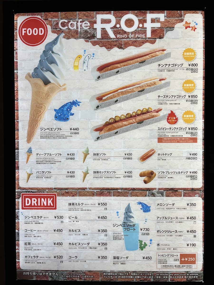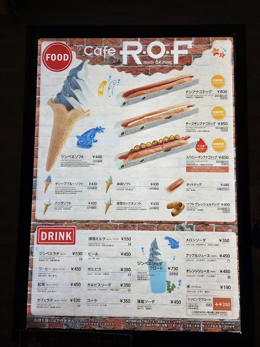 - Sweet Refreshments: The menu features various ramune-inspired items, from floats to enticing ice creams, ensuring a refreshing break during your aquarium adventure.